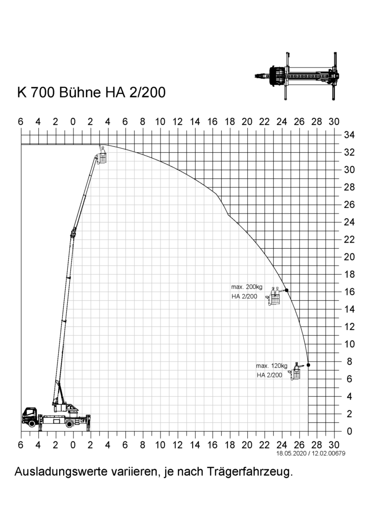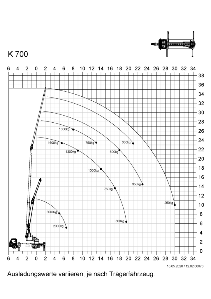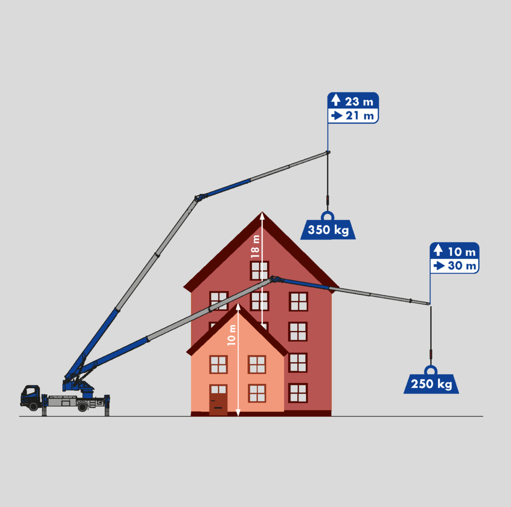 The K700, with a hook height of 34.5 m and a maximum load capacity of 3 tonnes, is equipped with many technical features that considerably simplify the daily work of roofers, carpenters and facade builders. Its compact dimensions and enormous lateral reach are impressive. For example, the K700 can transport loads of 250 kg to work areas 30 m away. Equipped with a double hydraulic, telescopic fly jip, it is the ideal crane in urban areas.