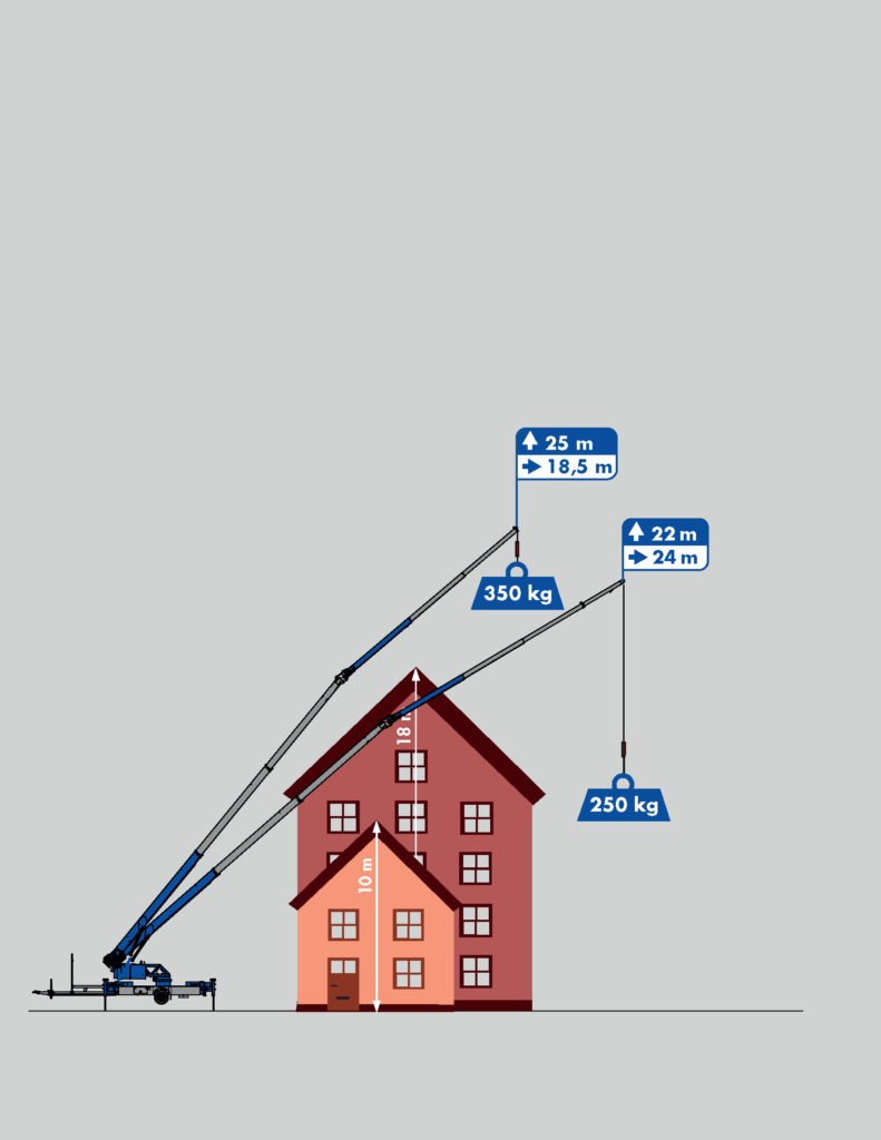 With a maximum load capacity of 3,000 kg, the K400 is the most powerful Klaas trailer crane, with a hook height of more than 34 m. Equipped with a duar hydraulically telescopic fly jib, it represents considerable added value for everyday work in the urban sector, on tight building sites and in assembly mode. The first two elements of the fly jib can be retracted or extended by remote control, even in platform mode. This means that the trailer crane can be set up even where there is little room, thus opening up new application areas for working with and without a platform.