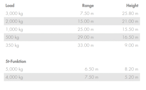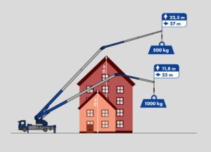 The K910 impresses with its hook height of over 39 m as well as its enormous strength. Its maximum load capacity is 5,000 kg, the lateral outreach with a load of 1,000 kg is 25 m. Equipped with a 2-fold hydraulically telescopic fly jib and a V-shaped outrigger with a maximum width of 6.14 m, the crane can be easily set up even where space is limited. The K910 is extremely manoeuvrable on an 18-tonne truck with a short wheelbase and is the ideal machine for inner-city areas.