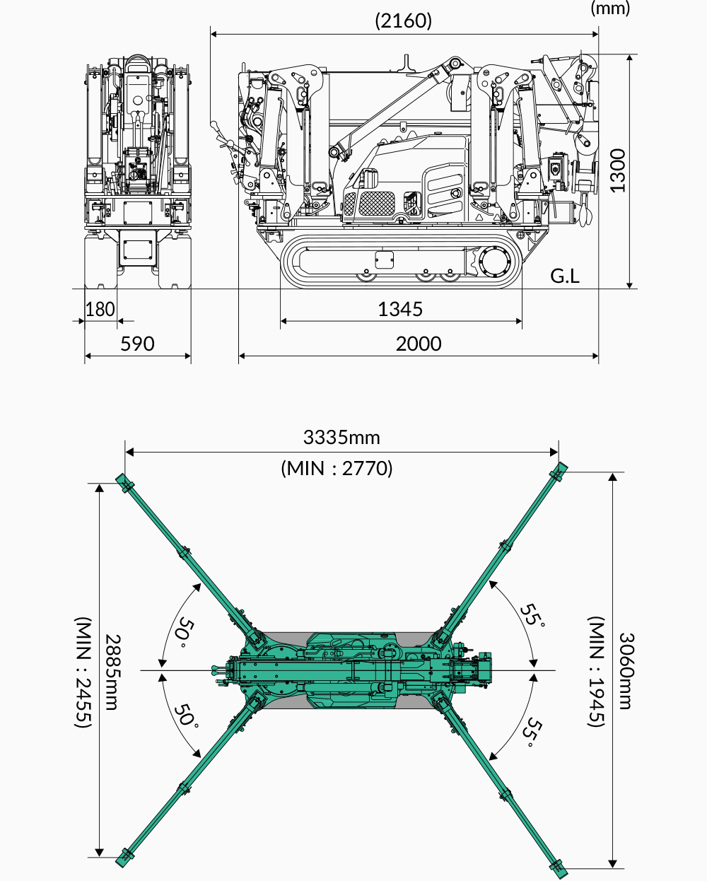 - Outrigger Max. Extended Width – (Lat.) 3,335mm x (Fr.) 3,060mm x (R.) 2,885mm