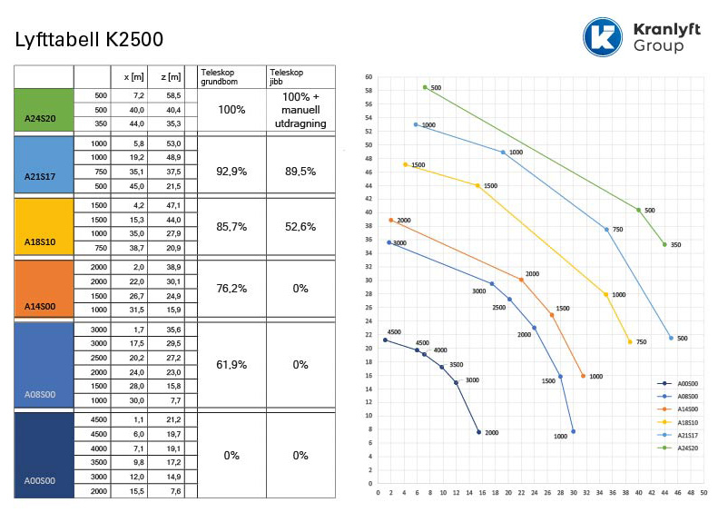 K2500 är den nya ”stora” från Klaas med rekordhöga prestandavärden. Tack vare ett innovativt mastsystem med trippel hydrauliskt teleskopisk fällbar jibb och ett litet fotavtryck på max. 7 m bredd är K2500 den perfekta kranen för stadskärnor med begränsat utrymme. Tack vare en räckvidd i sidled på 45 m med en last på 500 kg är allroundmaskinen även lämpad för att täcka stora takytor. K2500 imponerar särskilt med sina enorma räckviddsvärden i kombination med stora krokhöjder i lastområdet upp till 4,5 ton. Den nya toppmodellen Klaas når imponerande höjder och räckvidder även som arbetsplattform.