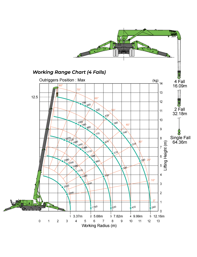 - Max. Arbetsradie – 12,16 m x 0,26 t