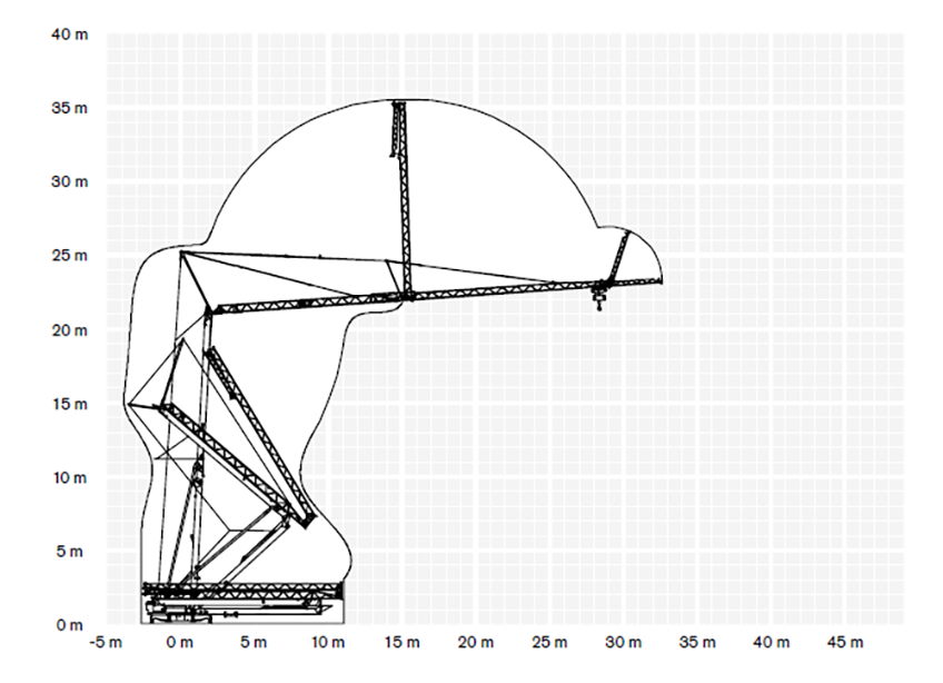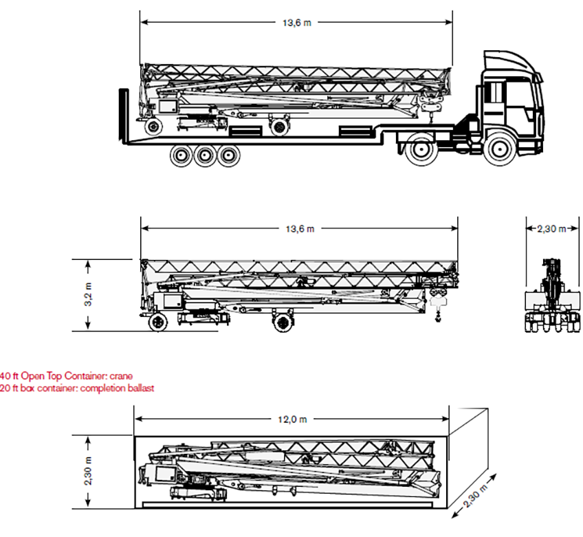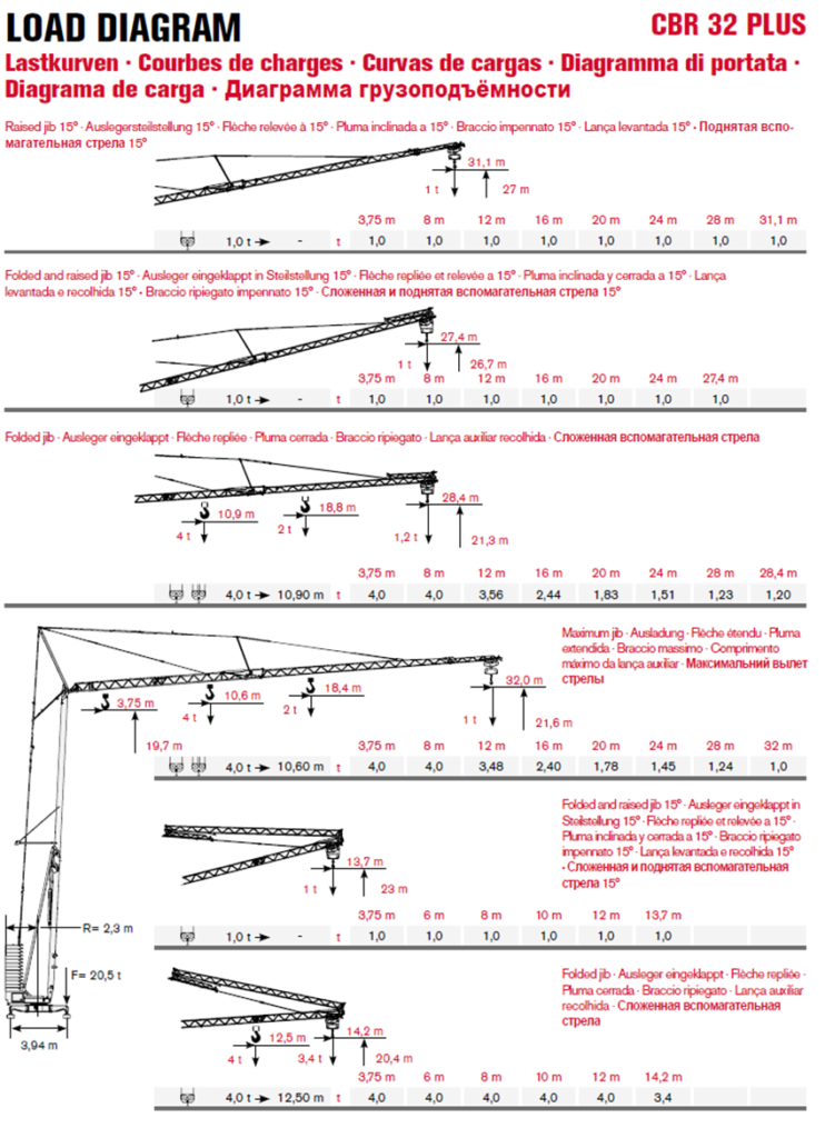 The CBR 32 PLUS self erecting tower crane has a maximum capacity of 4 t (4.4 USt) and a jib tip capacity of 1 t (1.1 USt).