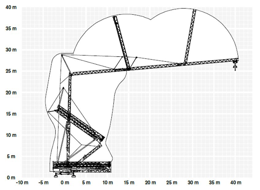 Tip load is 1.05 t (1.16 USt) and 1.15 t (1.27 USt) with TPP function. The hook height can vary between 25.6 and 32.2 m (84-106 ft). Its swing radius is 2.8 m (9.2 ft).