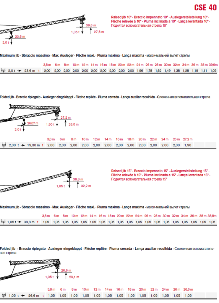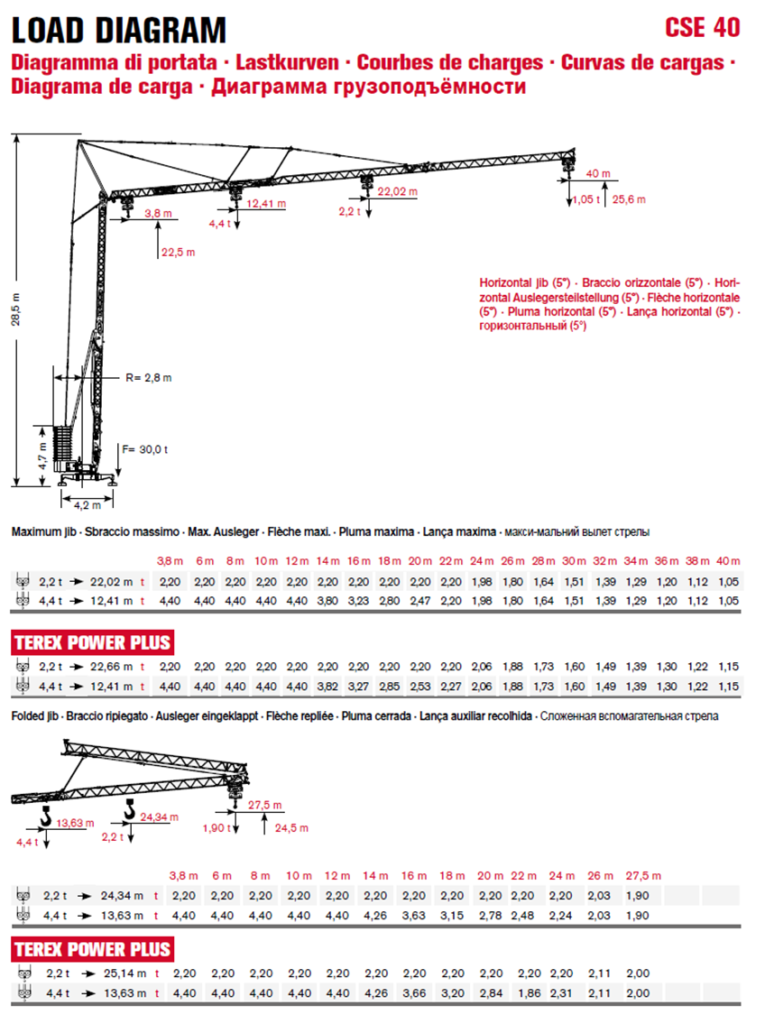 The new CSE 40 Self Erecting Tower Crane features a jib length of 40 m (131 ft) and a maximum capacity of 4.4 t (4.85 USt). The new crane design, motors and electronic control definitely improve performances and usability. The fully electronic control ensures an extremely precise setting and crane control and is equipped with new Terex Power Plus (TPP) and Terex Power Match functions.
